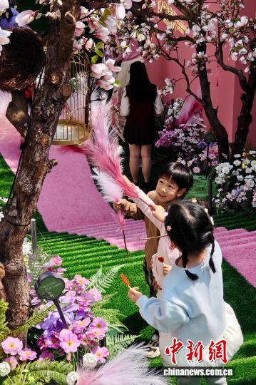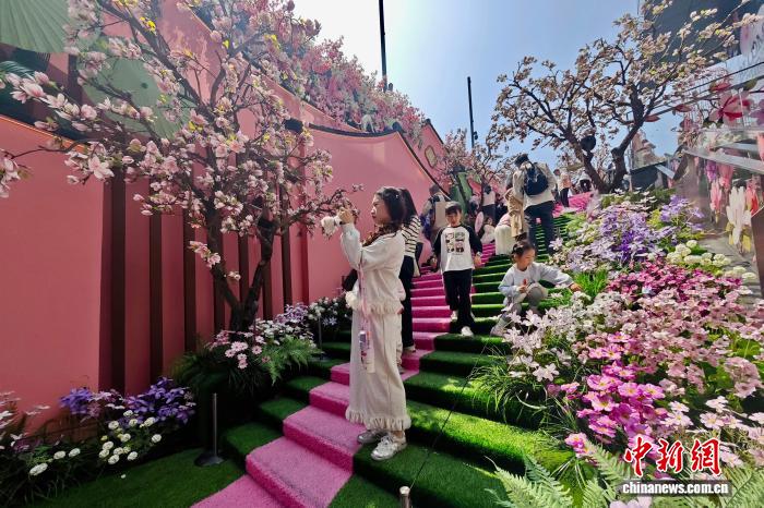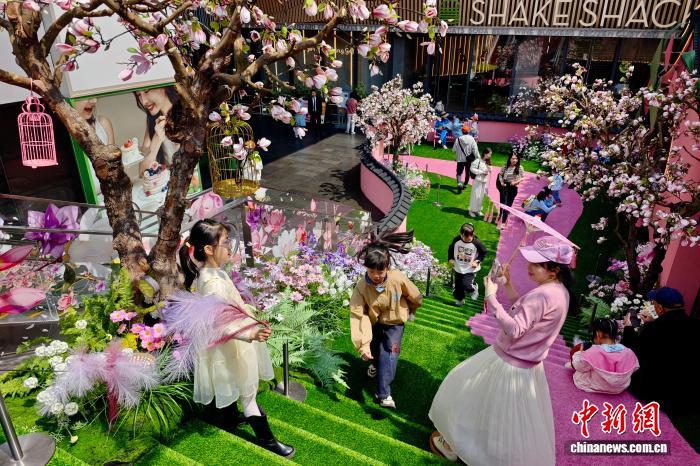 3月22日,祸修祸州,市平易近正在1处用假花打扮的人造制景景面玩耍。中新社记者 王东亮 摄